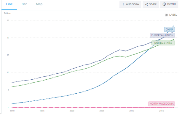 • Tani ekonomia më e madhe në botë në PPP (Kina është 15% më e madhe se SHBA-ja nga viti 2016, 3.6% e totalit global në vitin 1990 kundrejt 17.7% në vitin 2016)