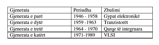 Teknika kompjuterike gjatë 50 viteve të fundit përshkon disa faza të zhvillimit në kuptimin e elementeve të ndryshme për konstruktimin e kompjuterëve elektronik. Këto faza paraqesin të ashtëquajturat gjenerata të kompjuterëve. Tabela që vijon tregon zhvillimin nëpër gjenerata të kompjuterëve.