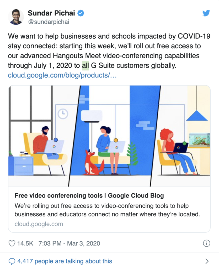 Në fillim të marsit, Google tha që do t’i bënte falas paketat premium të “Hangouts Meet” deri në 1 korrik. Të martën, ky vendim u shty deri në 30 shtator.